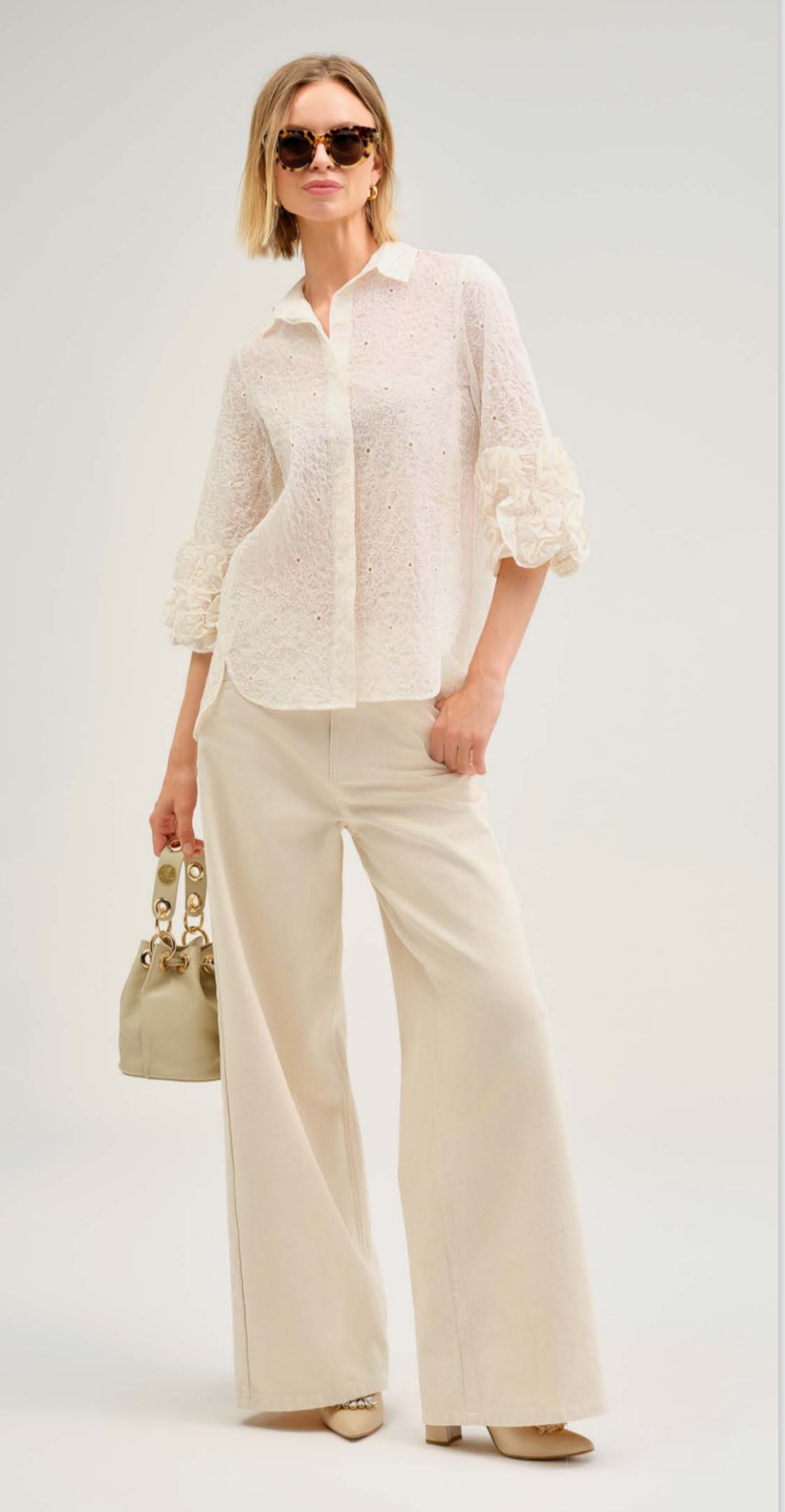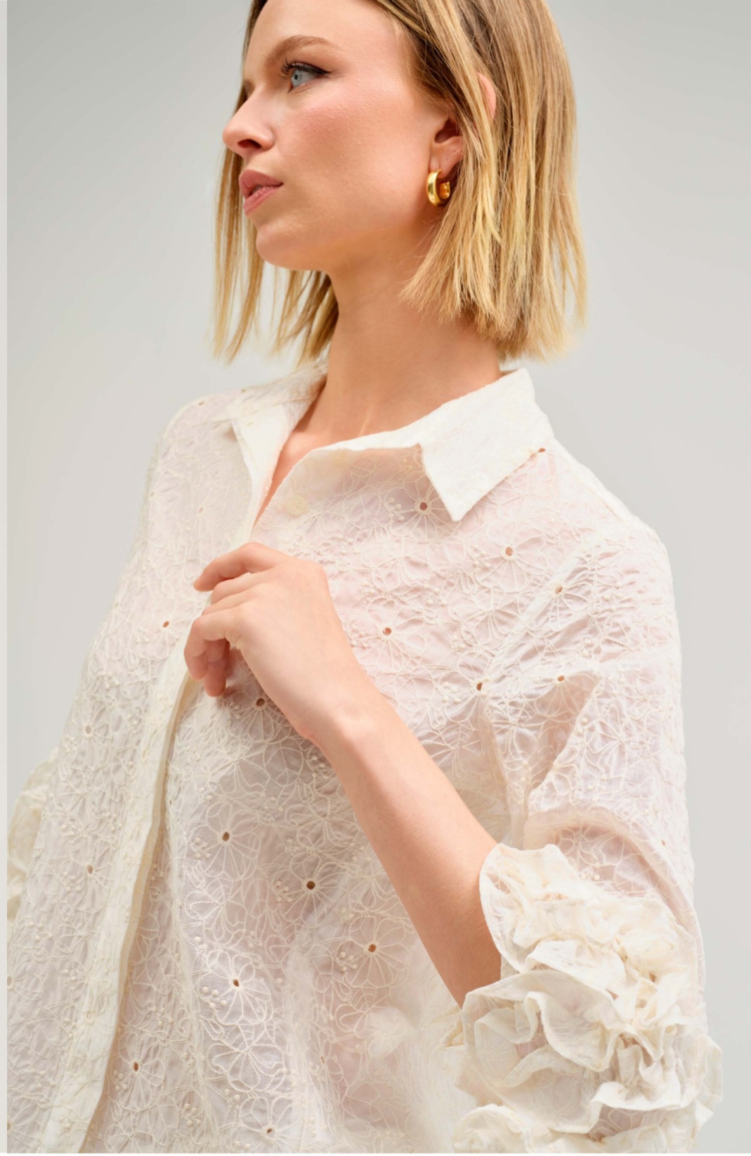 Adaugă o notă de rafinament suprem garderobei tale cu această cămașă reaalizată dintr-un material delicat, brodat integral. Piesa impresionează prin echilibrul perfect între textura bogată a dantelei și croiala modernă, ușor supradimensionată.