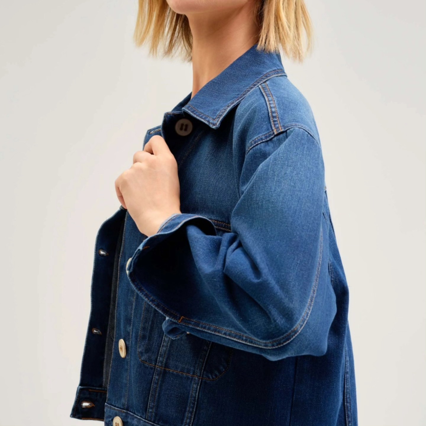 - Material și estetică: Jacheta este realizată dintr-un denim de înaltă calitate, într-o nuanță de albastru indigo saturat, cu ușoare degradeuri care îi conferă profunzime. Textura materialului sugerează un amestec moale, plăcut la atingere, care se așază impecabil.