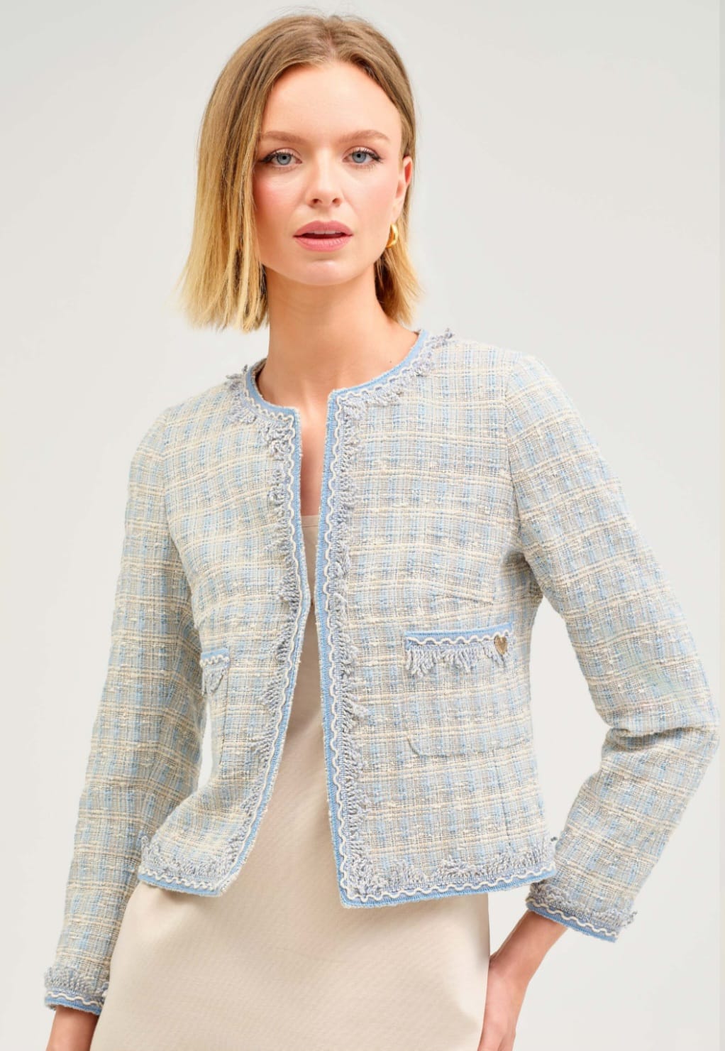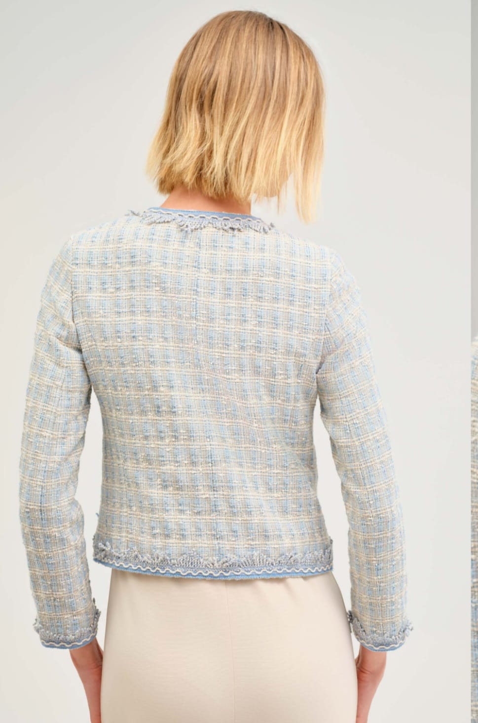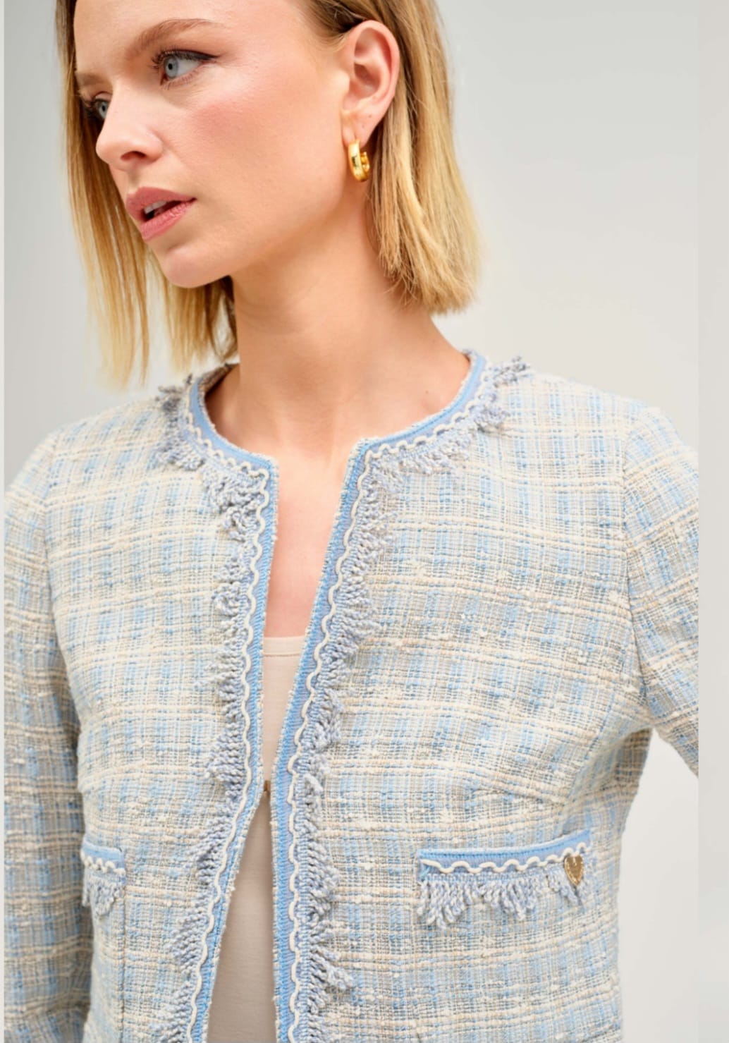 Jacheta din tweed in nuante pastelate de albastru si crem