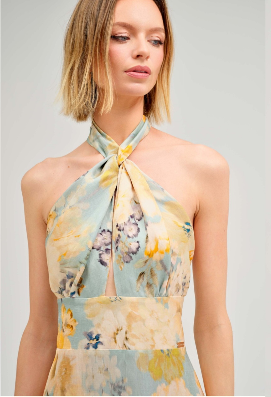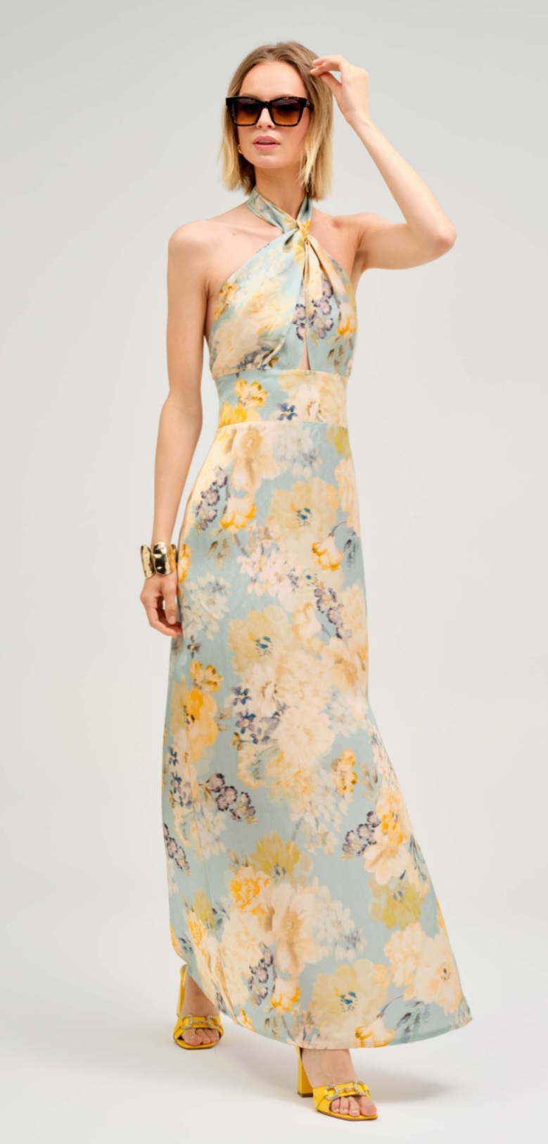 Redescoperă feminitatea cu această rochie de ocazie premium, o piesă statement din noua colecție Cristina Barros. Creată pentru evenimentele unde rafinamentul este obligatoriu, rochia îmbină armonios un croi spectaculos cu un imprimeu floral romantic în nuanțe de bleu pastel, galben solar și accente lila.