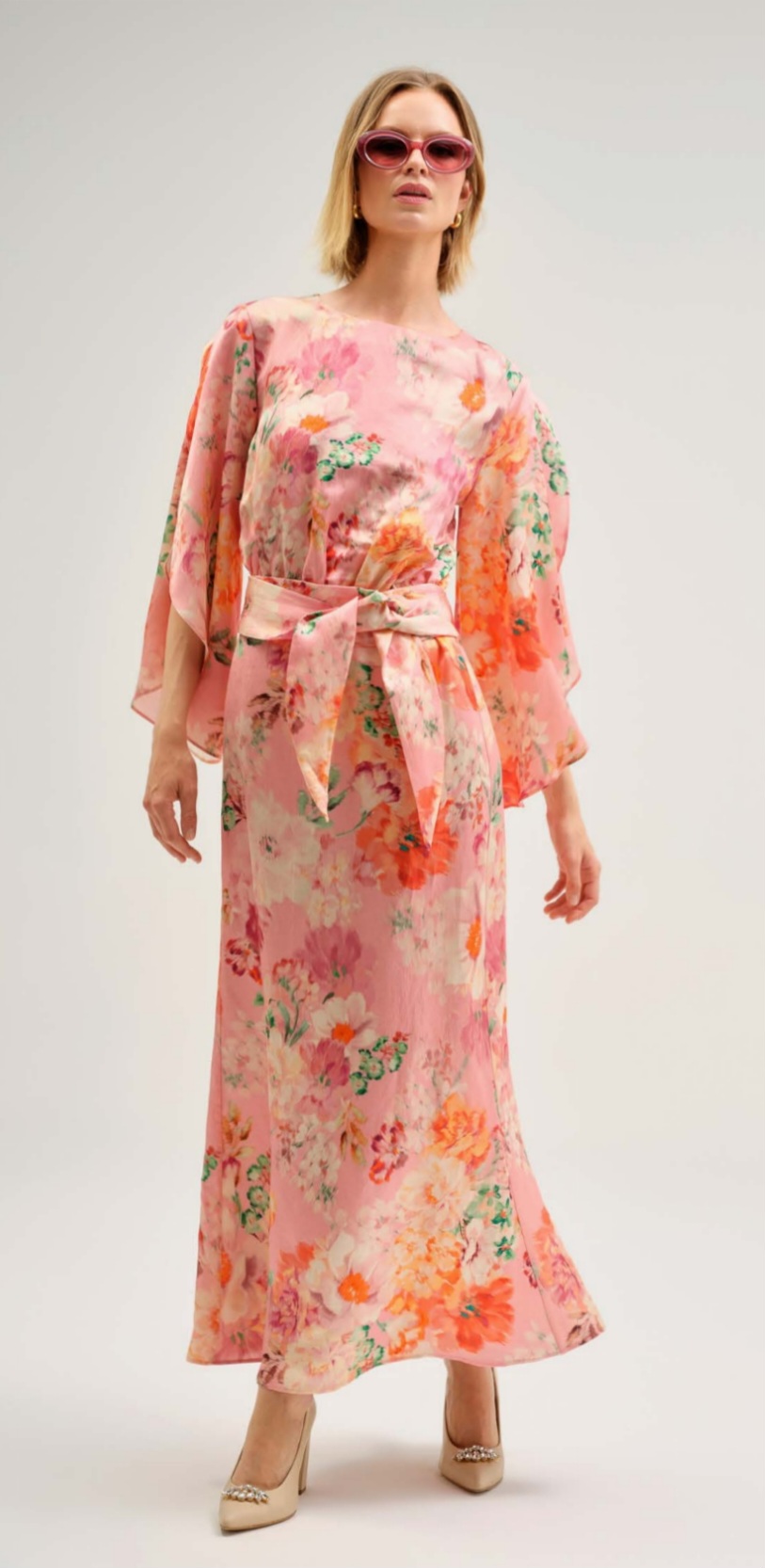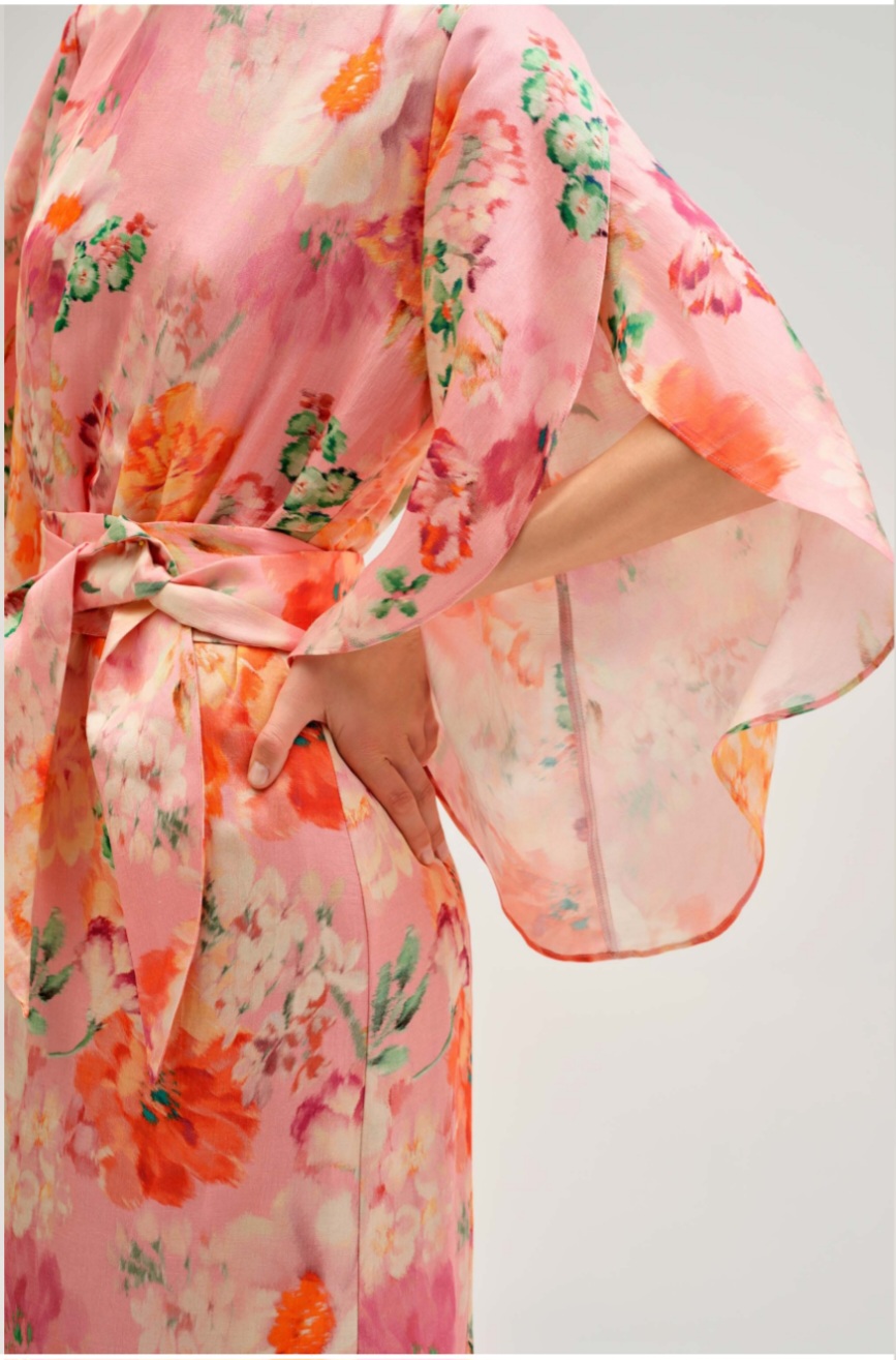 - Imprimeu Vibrant: O explozie de flori în nuanțe de roz, portocaliu și accente verzi, ideală pentru evenimentele de zi sau ocaziile speciale de seară.